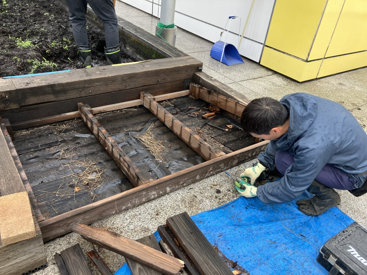 内側の養生シートの補強に加え、経年劣化により損傷していたウッドデッキの改修を行い、設備面の整備も図りました。